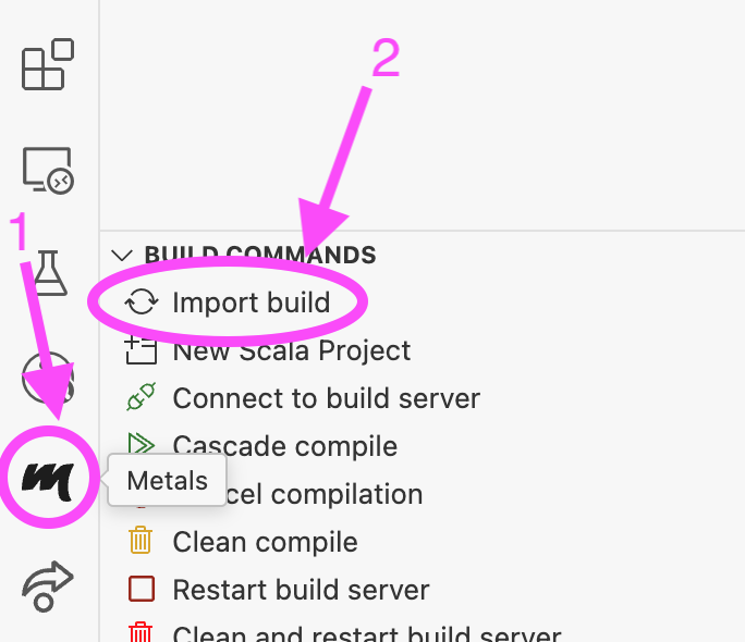 If there’s still no pop up, or nothing happens after 30 seconds, you can click the Metals button with the “m” logo in the left panel, then click “Import build” in the Metals sidebar that appears: