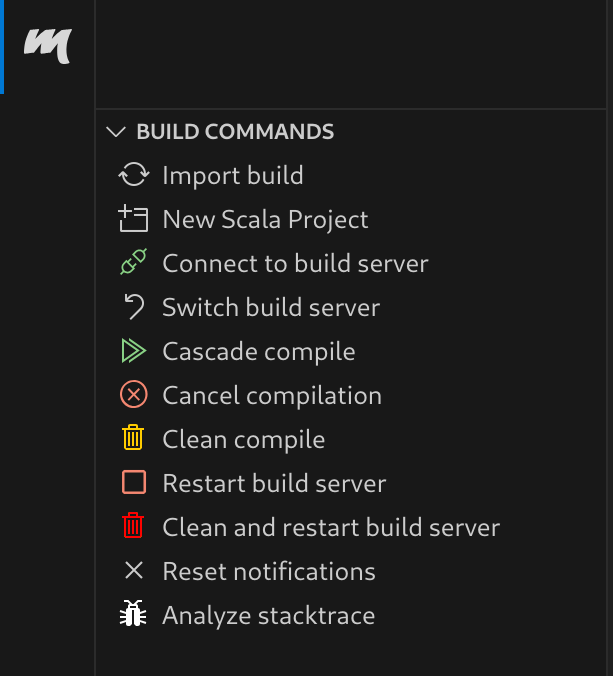 Once all errors are fixed, click the Metals icon in the left panel of VSCode, then click “Clean and restart build server” in the Metals menu, then wait for Metals to import the build. If this does not help, try “Clean compile workspace” instead.