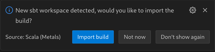 yfor “Yes” when the installer asks whether it should add Scala and SBT to the path. - For VSCode on MacOS, follow the official instructions.