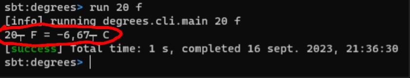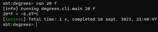 After this, the problem should be fixed. Test it out by running the same command that gave you weird characters before. For example, running run 20 f within sbt in the degrees lab should output: